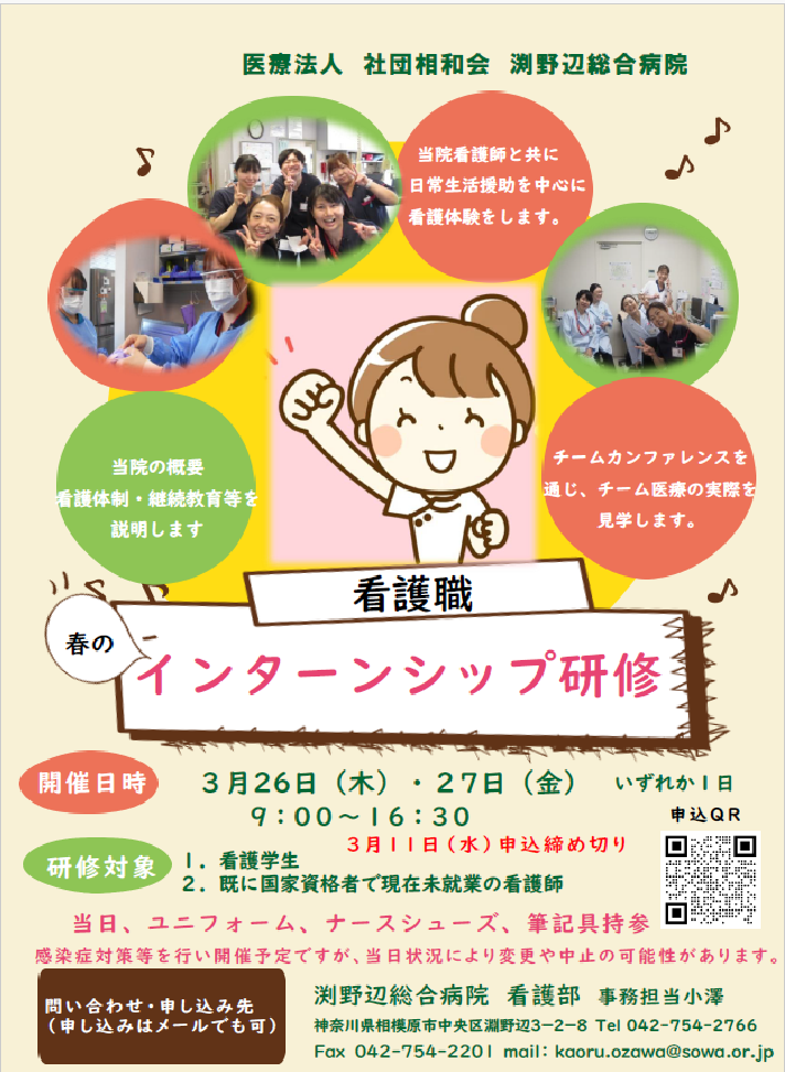 看護師を目指し就職活動を始められる学生の方や、再就職で悩んでいる方を対象に、インターンシップ研修を行います。 実際に病院の雰囲気触れ、仕事を『見て』『聞いて』『感じる』ことができるこの機会に、ぜひ渕野辺総合病院に看護体験にいらっしゃいませんか? 相模原市で地域医療の中核となる当院の温かみのある看護を体感してください。 皆様の応募を心からお待ちしております。