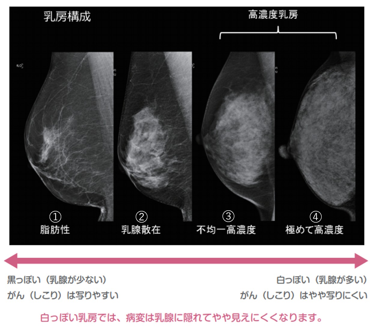 このうち、乳腺の豊富な「極めて高濃度乳房」、「不均一高濃度乳房」の2つをあわせて「高濃度乳房」と呼びます。 年齢が若いほど高濃度乳房になりやすい (白っぽく写る)傾向にあります。 加齢に伴い乳腺は脂肪へと置き換わっていき、写真では黒っぽく変化していきます。